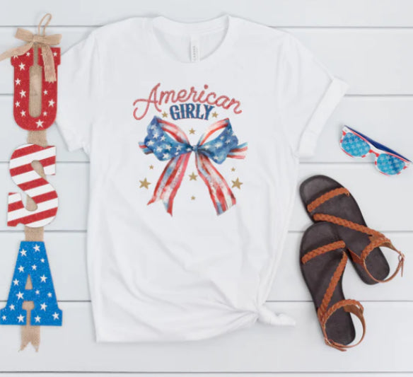 Get ready to show off your American pride in a girly, playful way with our American Girly Bow tee! With its stars and stripes design, this tee will make you feel like an all-American girl. Perfect for any casual occasion, this tee is a must-have for your wardrobe. (Seriously, who wouldn't want this tee?!)