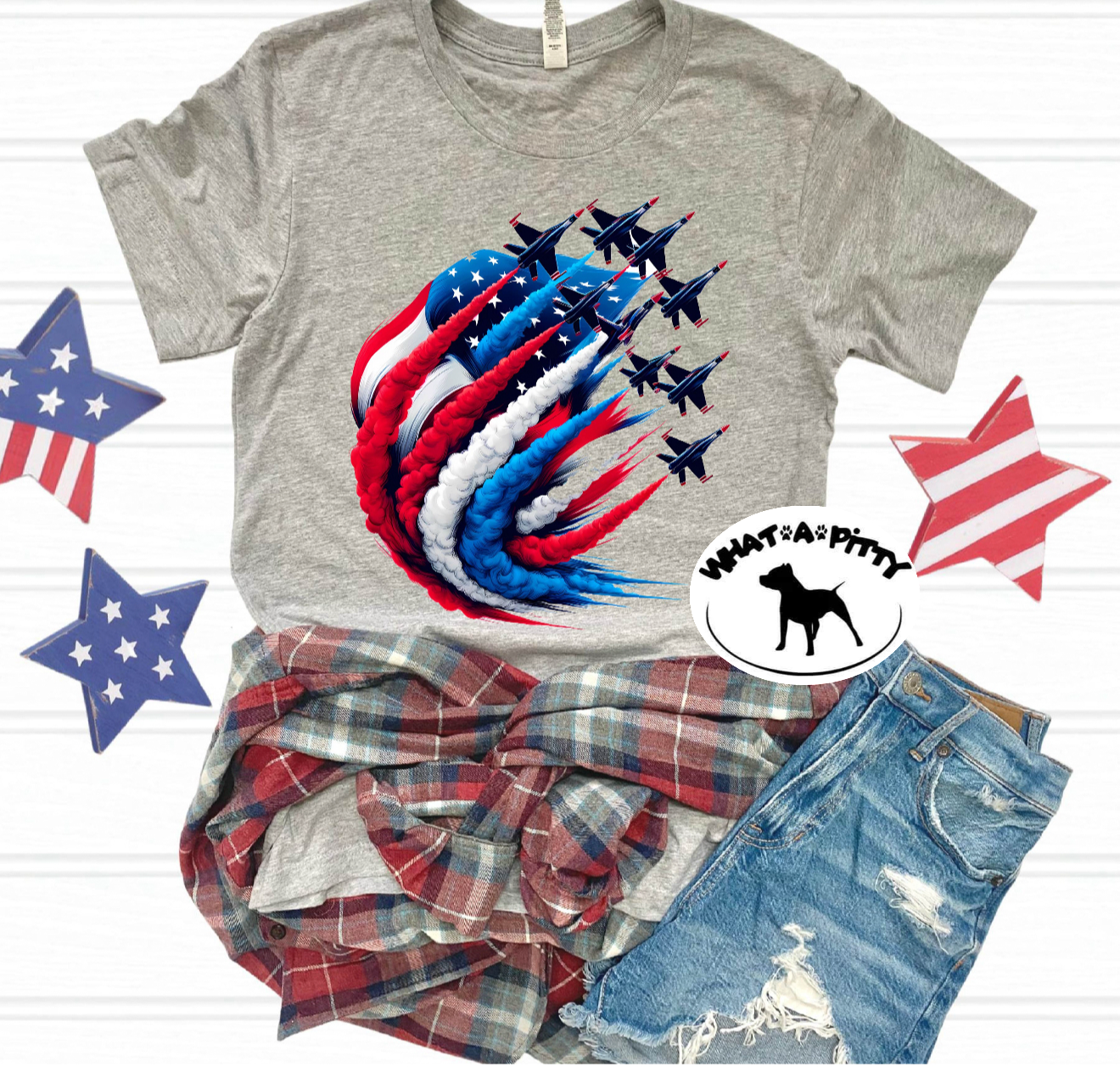 Celebrate your patriotic spirit with the American Jet Stream tee, featuring sleek planes soaring across the sky. Perfect for showing off your love for the USA with a fun, bold style that’s ready for any adventure.