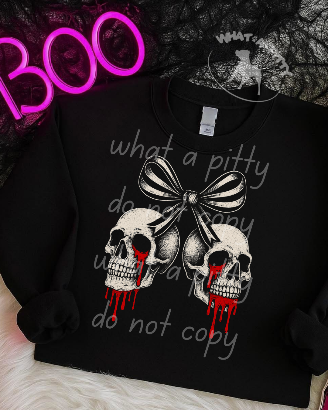 Make a bold statement with this stunning designer original featuring skulls dripping with blood, paired with a black and white bow for a playful twist. Only available on black, this unique piece combines edgy vibes with a touch of fun, perfect for those who love to stand out!