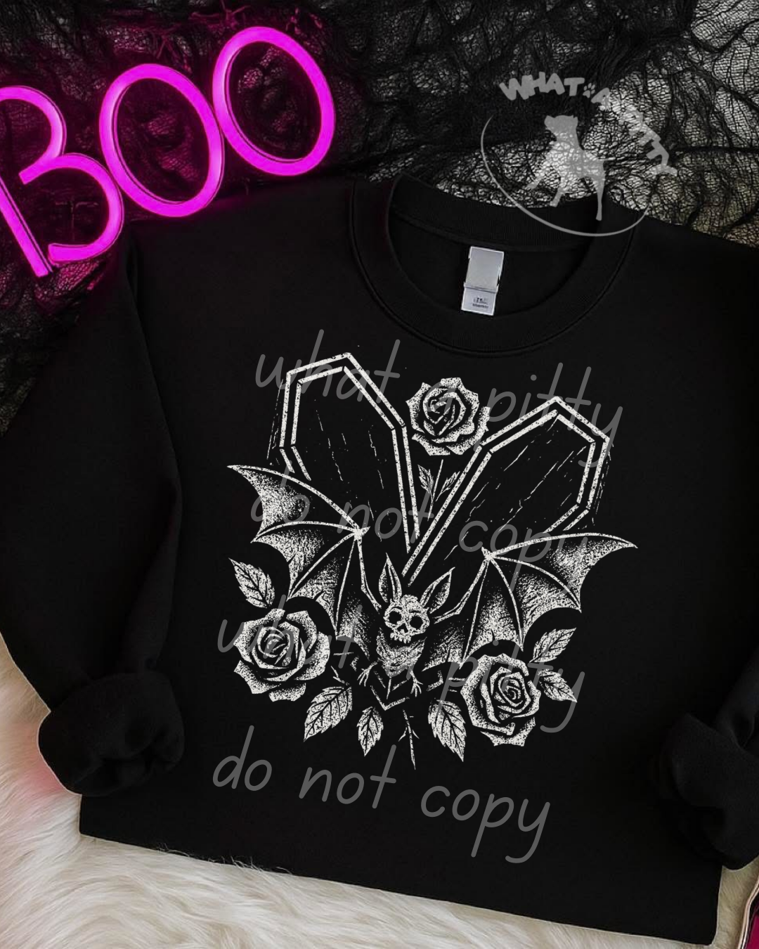 Show off your spooky side with this designer original featuring a playful mix of crossed coffins, a bat, and roses. Only available on black, this unique design adds a fun and edgy flair to your wardrobe while celebrating gothic charm with a twist!