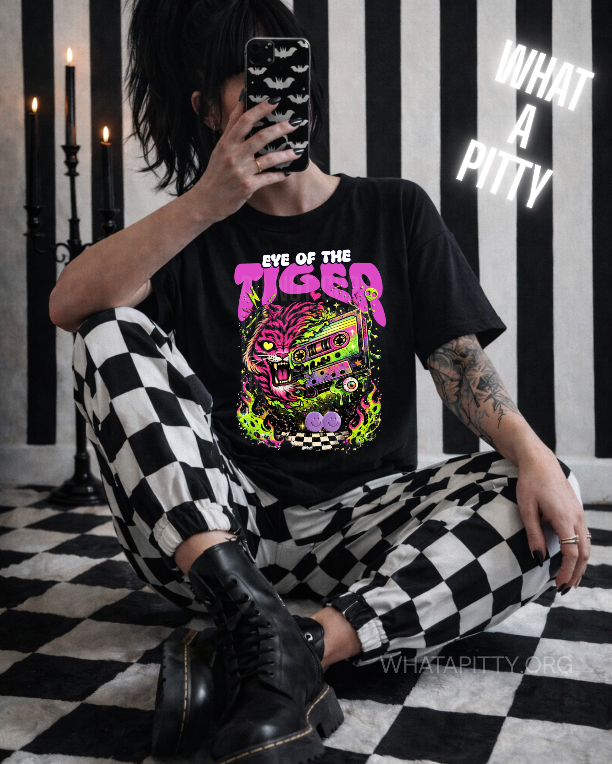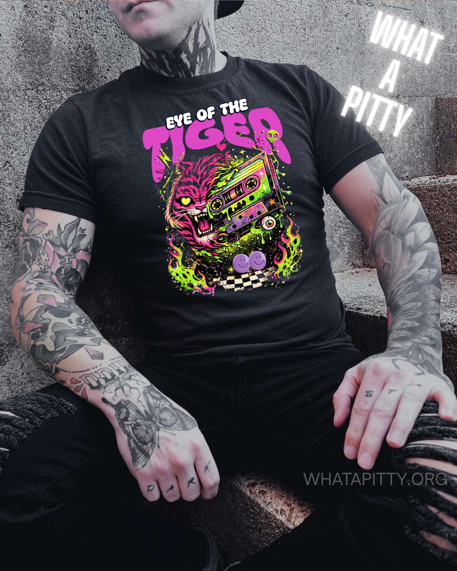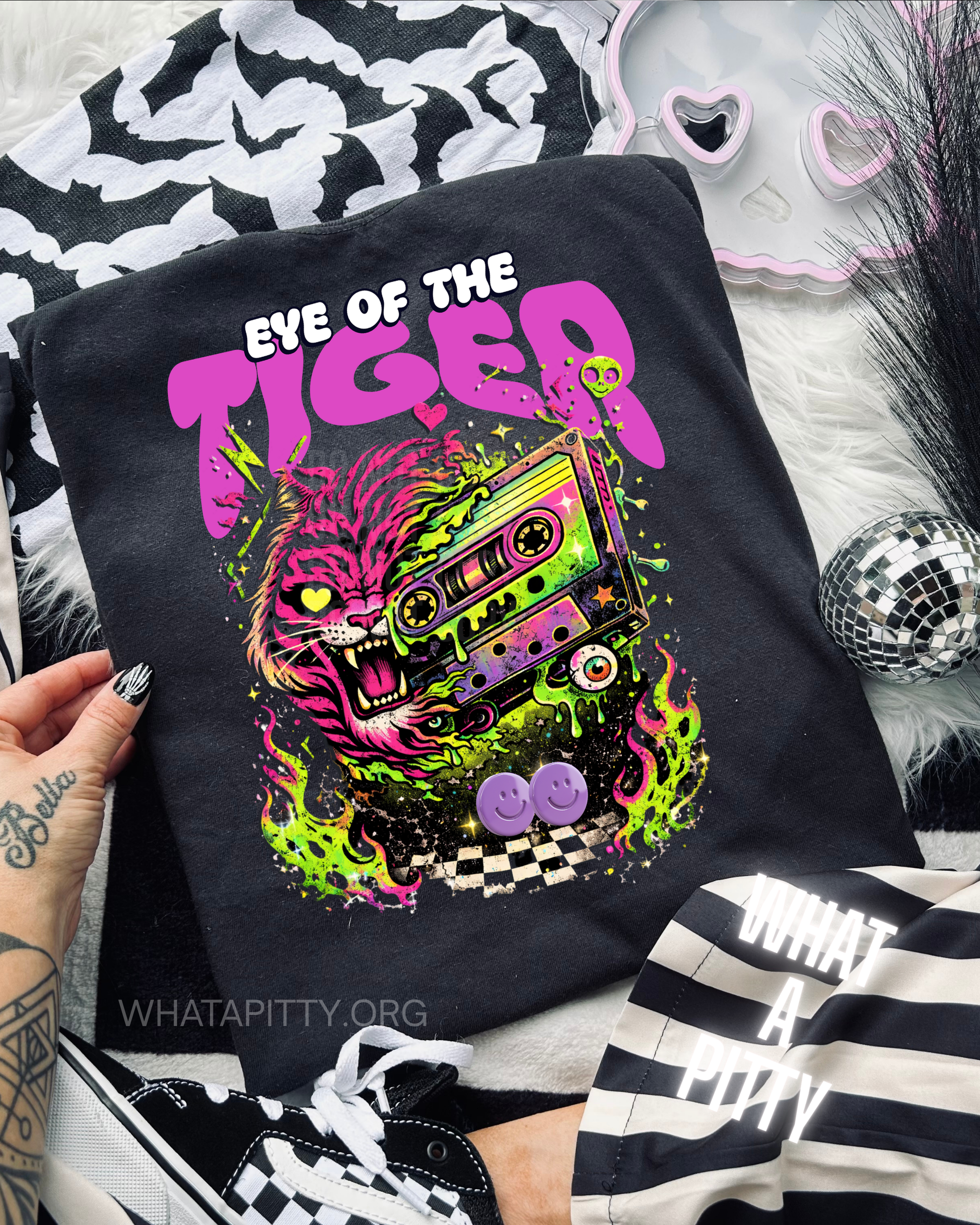 Rewind to the radical '80s with this neon-soaked designer original featuring a fierce pink tiger prowling across a vintage cassette tape. Bursting with electric neon green, bold black, crisp white, vibrant purple, and hot neon pink, this design captures the essence of retro excess with an edgy modern attitude. It's nostalgia meets attitude—perfect for anyone ready to hunt down their dreams with style and swagger.