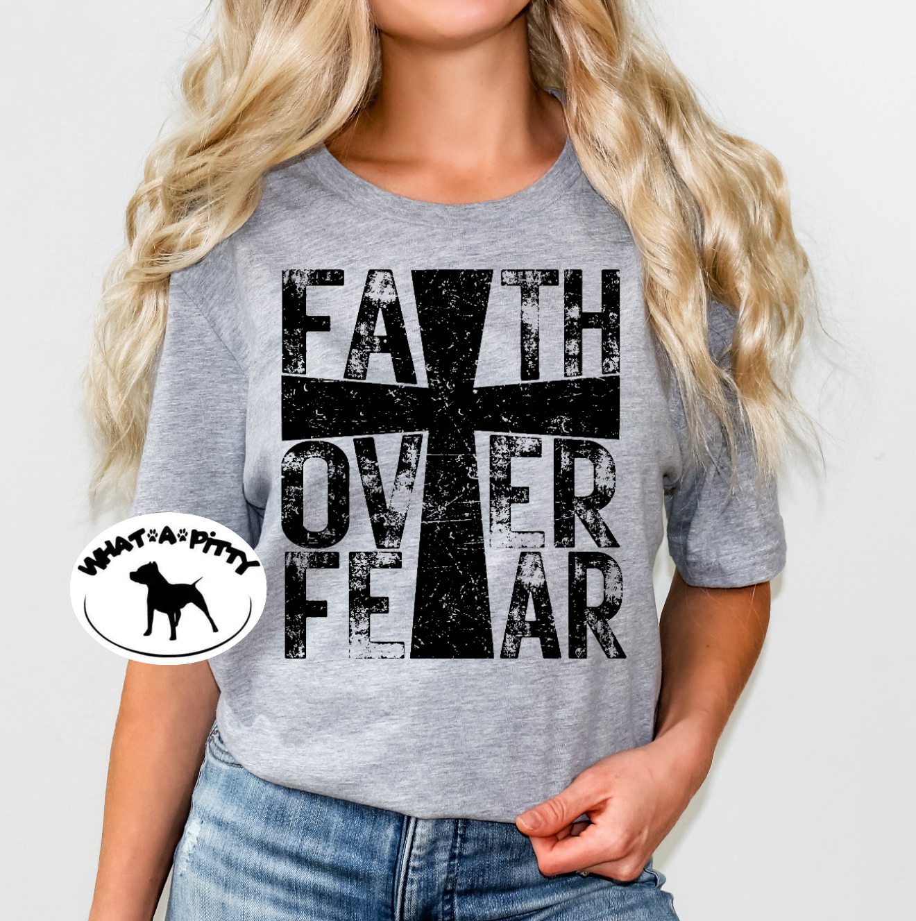 Let faith triumph over fear with our playful and beautiful Faith over Fear cross tee. Featuring a distressed print, this tee will add a touch of uniqueness to your wardrobe while reminding you to always trust in the power of faith.
