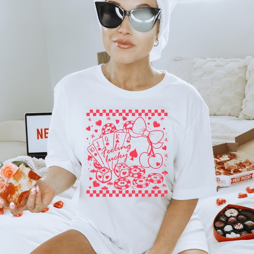 Feeling lucky? This "Feeling Lucky!" tee is your perfect companion! With vibrant red ink, dice, cards, cherries, and poker chips, this playful design is sure to bring you good fortune. Don't miss out on this beautiful and fun addition to your wardrobe! Luck be a Lady!