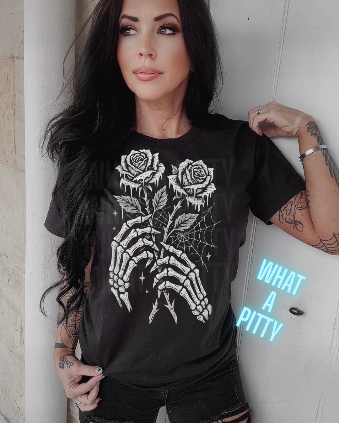 Frost Bite Roses is a designer original that freezes romance in time. Skeletal hands cradle two delicate roses adorned with icicles that drip with winter's chill, all set against an intricate spider web backdrop rendered in pristine white ink. This haunting composition merges beauty with darkness, tenderness with danger—a visual paradox that captivates. Designed exclusively for black apparel, this piece celebrates the exquisite tension between love and loss, warmth and cold, life and the macabre.