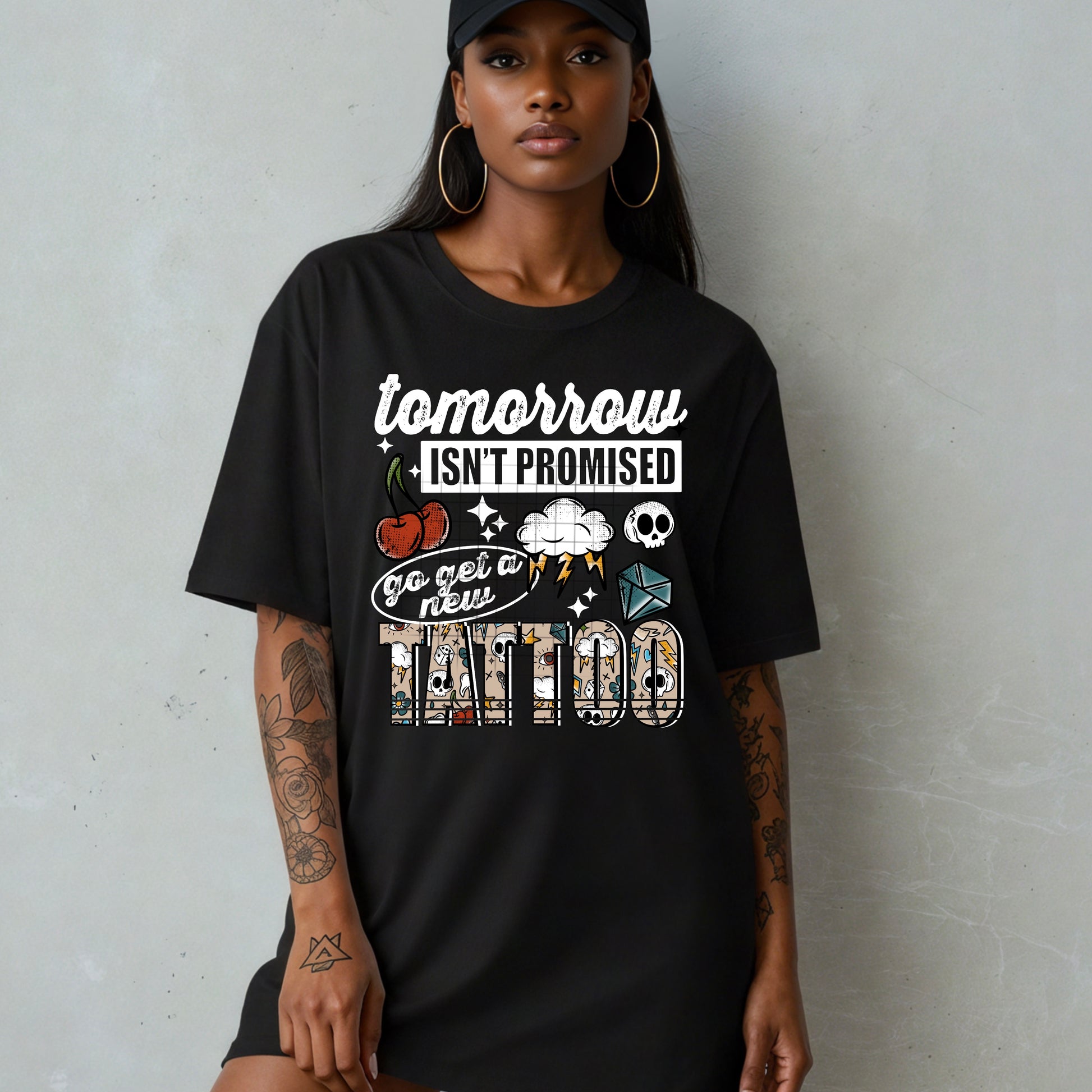 Seize the moment in this bold designer original tee featuring "tomorrow isn't promised" in striking white ink. Perfect for those who live life on their own terms, this colorful statement piece celebrates spontaneity and self-expression. Whether you're channeling your inner rebel or just ready to shake things up, this tee delivers attitude with style. Make your mark—literally.