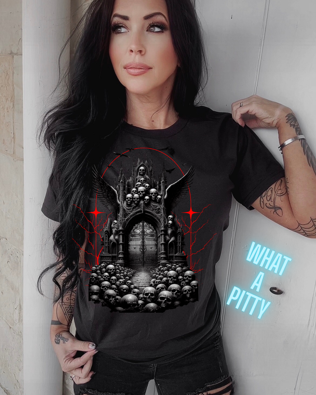 Hells Gates unleashes a designer original masterpiece with white and red ink creating an intricate skull-filled composition that's absolutely mesmerizing. Skulls dance across the design in a stunning display of artistic rebellion and edgy sophistication. This isn't just a graphic—it's a bold declaration for those who thrive on dark aesthetics and aren't afraid to make a statement. A collector's piece that proves attitude looks incredible when rendered with this level of creative detail.
