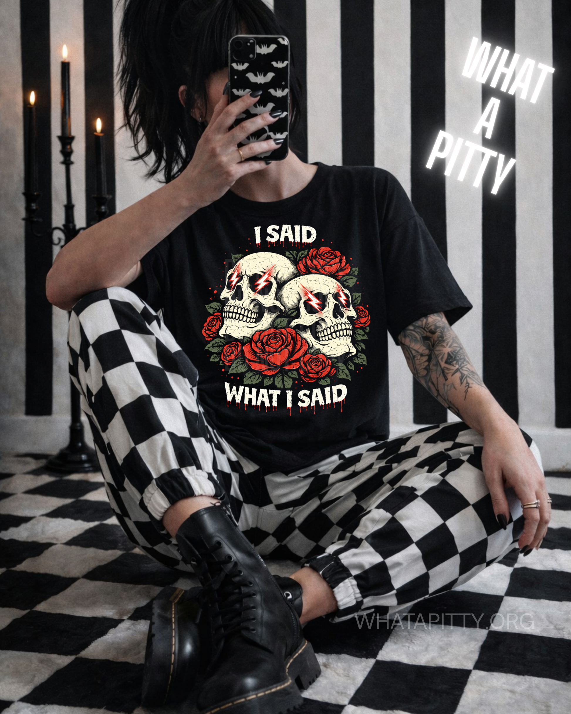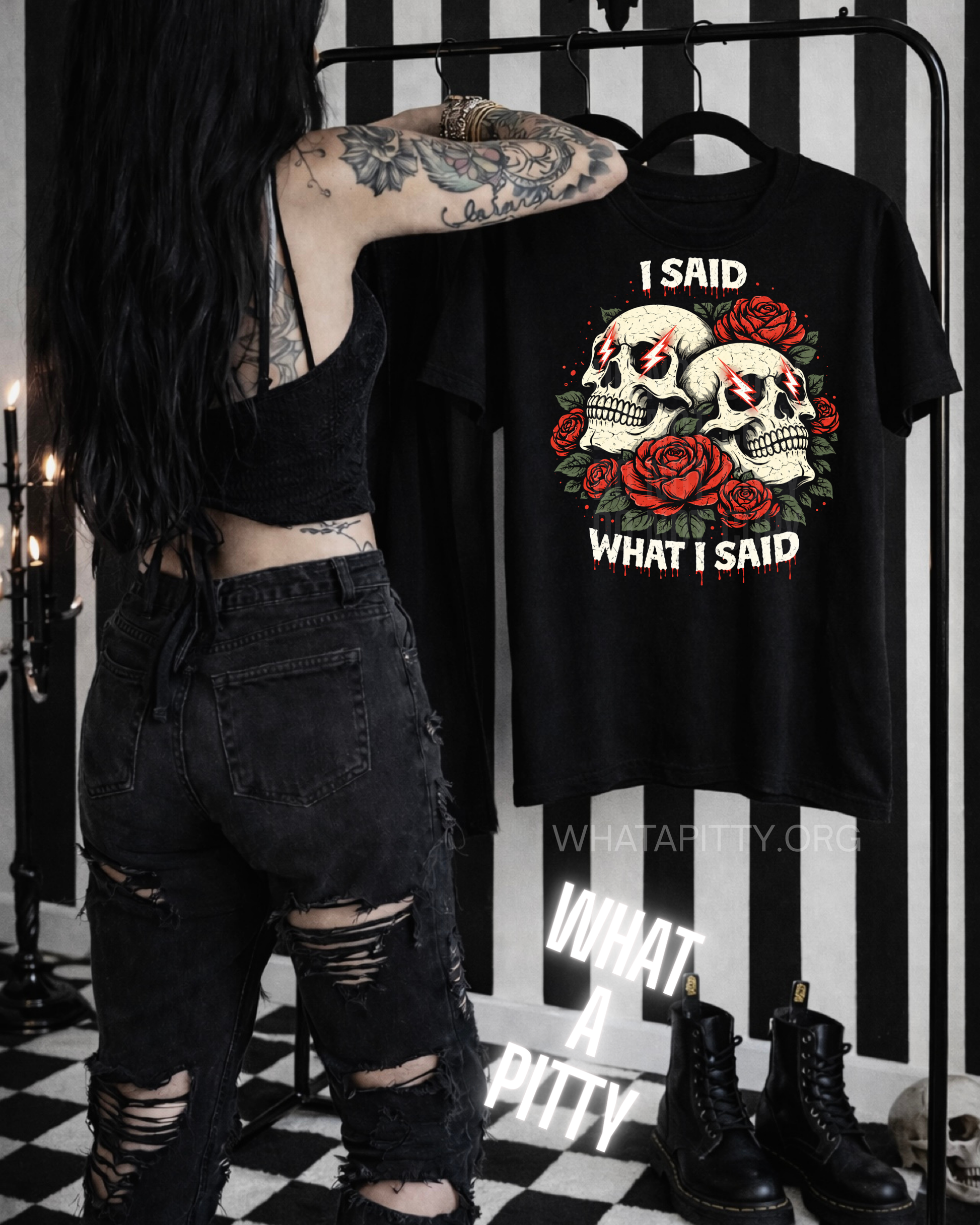 Double the attitude with this bold designer original featuring two skulls locked in a stare-down, lightning bolts blazing from their eyes. Framed by deep red roses, this design screams confidence and conviction—because sometimes you've got to say what you said and own it completely. Edgy, electric, and unapologetically fierce.