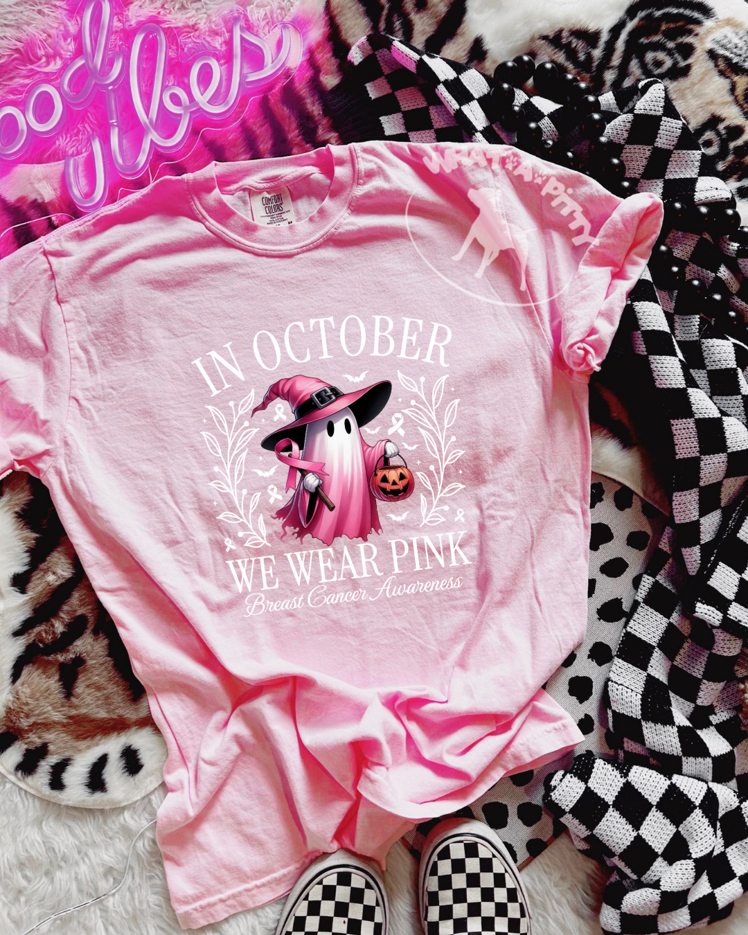 Show your playful side with the In October Ghost (White Ink) tee. Featuring an adorable ghost carrying a pink ribbon and the fun slogan "In October we wear pink," this girly design adds charm and a touch of whimsy to your Halloween wardrobe. Perfect for celebrating the season with cute and spirited style.