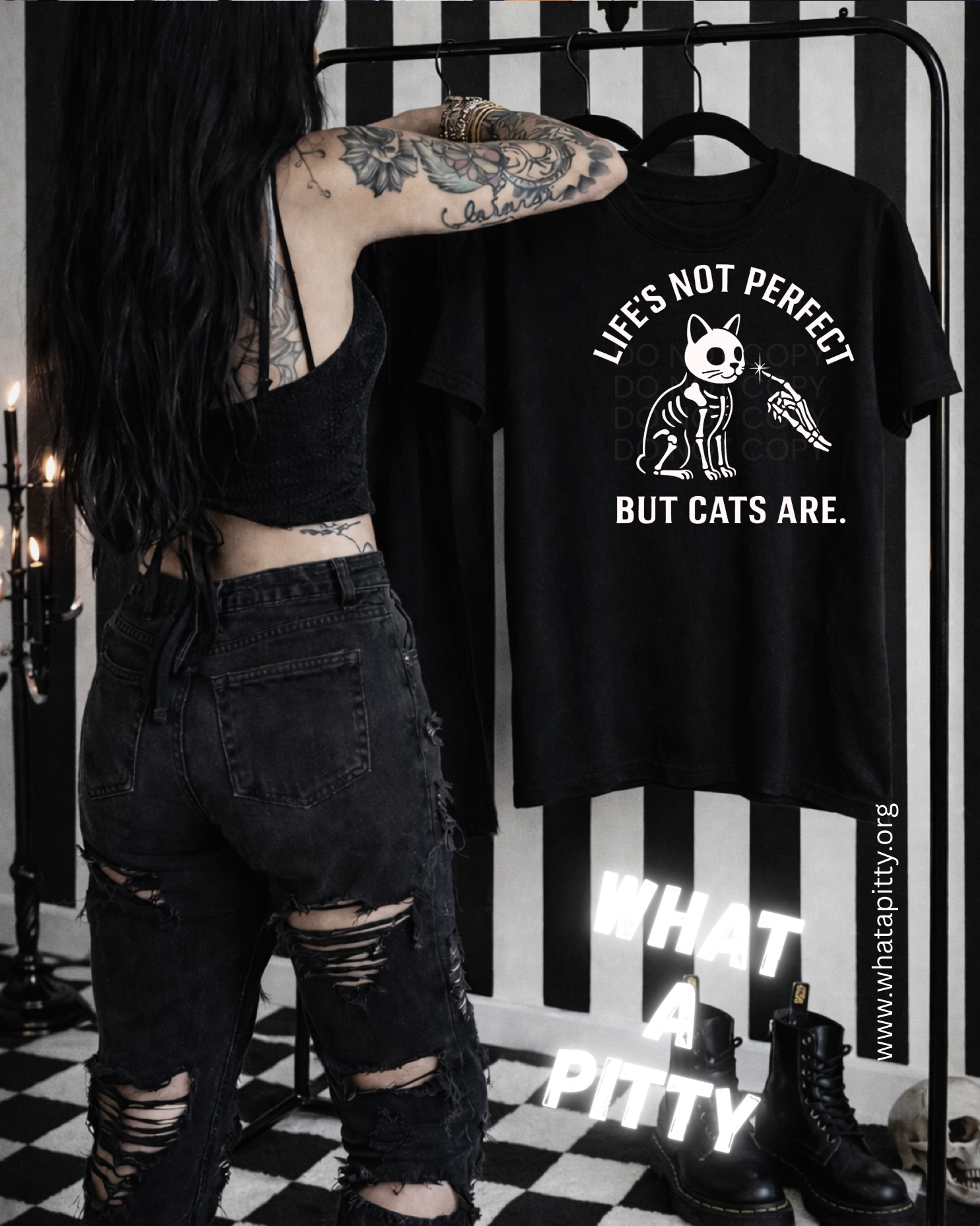 Meet the purrfect companion for cat lovers who appreciate a little attitude. This designer original features a cheeky skellie cat caught mid-boop, complete with that irresistible snoot-booping moment we all crave. With edgy vibes and playful charm, it's the ideal piece for anyone who knows life's messy but cats make it better. Bold, quirky, and unapologetically fun—because perfection is overrated anyway.