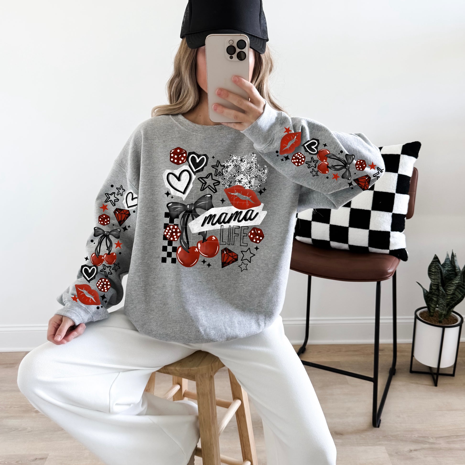 Embrace your lucky side in this vibrant sweatshirt bursting with designer-original flair. The striking red, black, and white palette features playful graphics of cherries, hearts, diamonds, and dice scattered across the body and sleeves—perfect for mamas who know how to have fun. Whether you're feeling fortunate or just want to spread good vibes, this cozy piece celebrates confidence and charm with every wear.