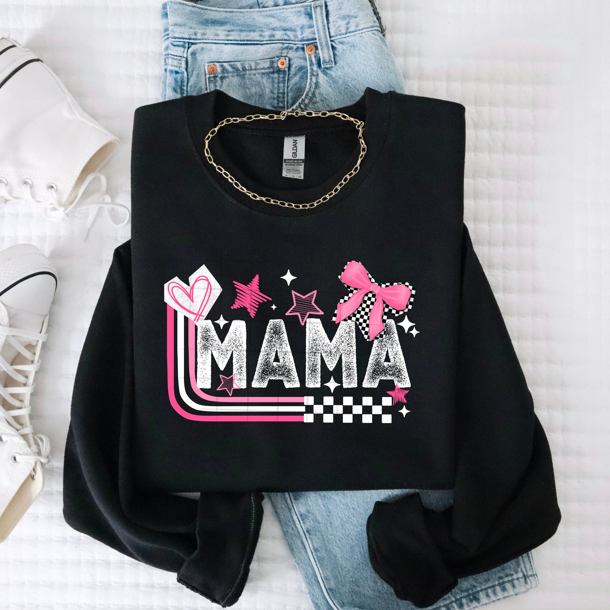 Celebrate motherhood with this adorable tee featuring a charming pink bow and heart design printed in crisp white ink. Sweet, sassy, and unapologetically feminine, this pretty piece is perfect for mamas who want to show their softer side without sacrificing style. Whether you're running errands or hanging with your crew, this playful design lets everyone know you're rocking the mom life with grace and a whole lot of flair.