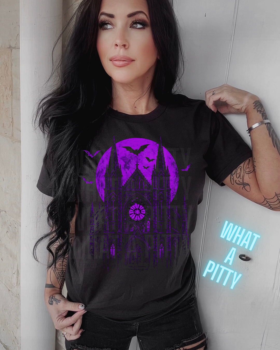 Purple Cathedral is a stunning designer original that commands attention on black apparel. This eye-catching graphic transforms any dark garment into a wearable work of art, with intricate details that pop against the deep backdrop. Perfect for those who appreciate bold, artistic statements that refuse to blend in. A true collector's piece for fashion-forward individuals who want their wardrobe to make an impression.