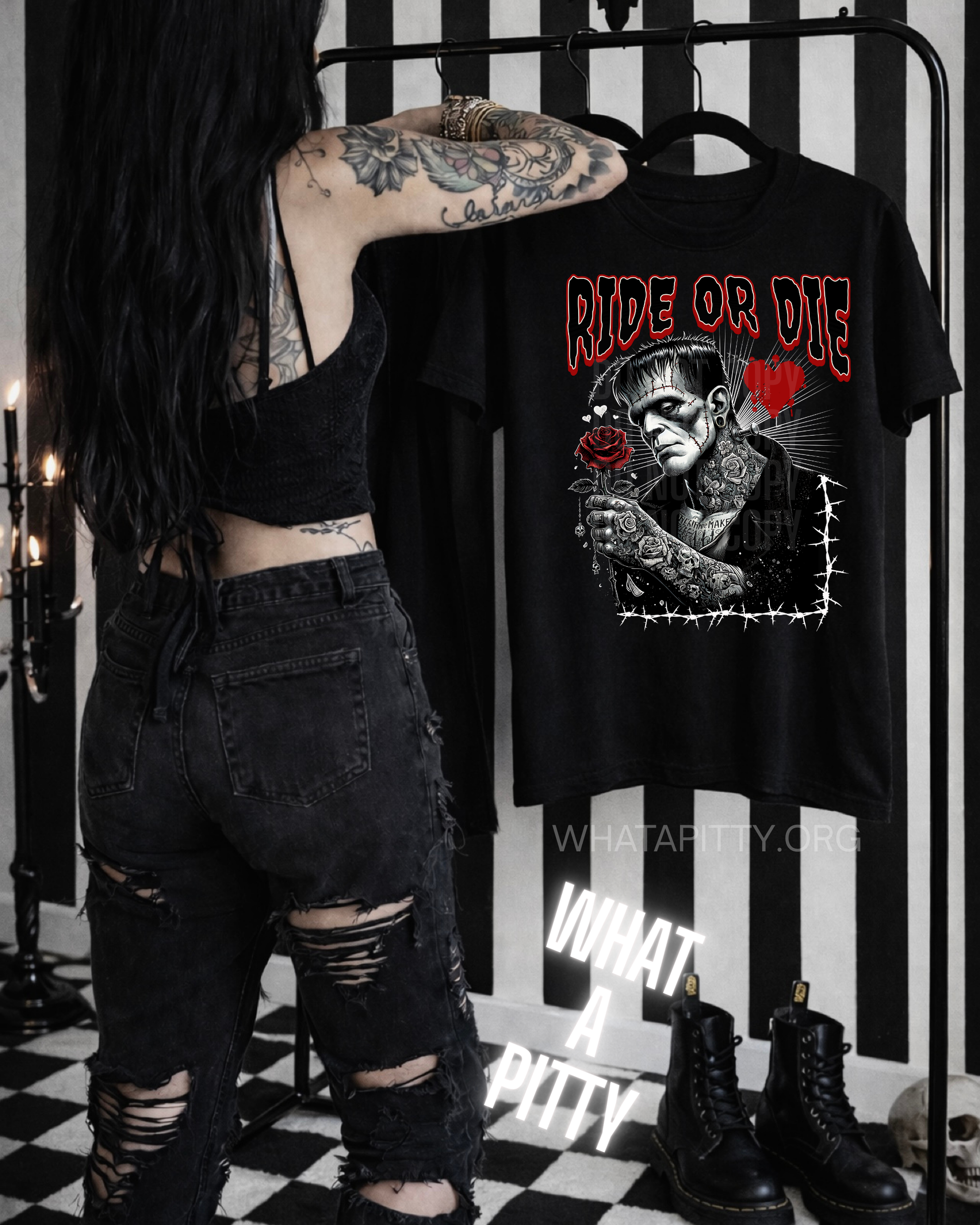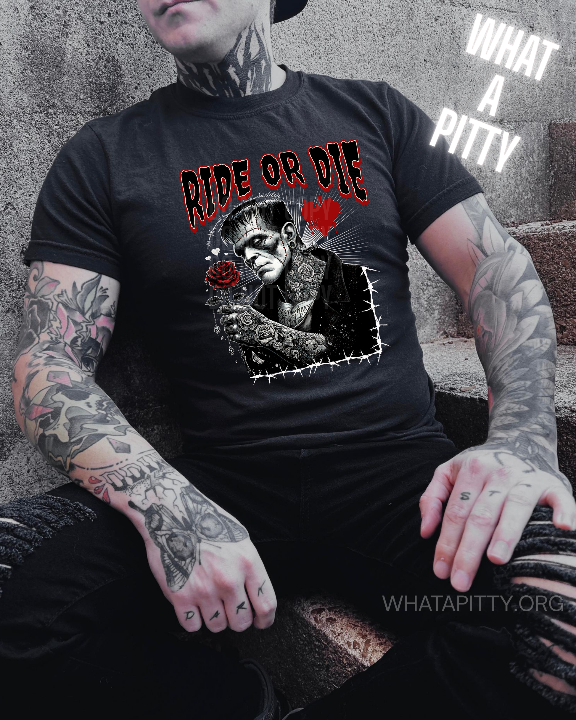 Meet Frankie—a tattooed monster with a heart as bold as his ink, clutching a crimson rose in this striking designer original. Rendered in classic black, white, and red, this design captures the essence of ride-or-die devotion with an edgy twist. It's a playful celebration of finding love in unexpected places and proving that even monsters deserve romance. Wear it and show the world your softer, scarier side.