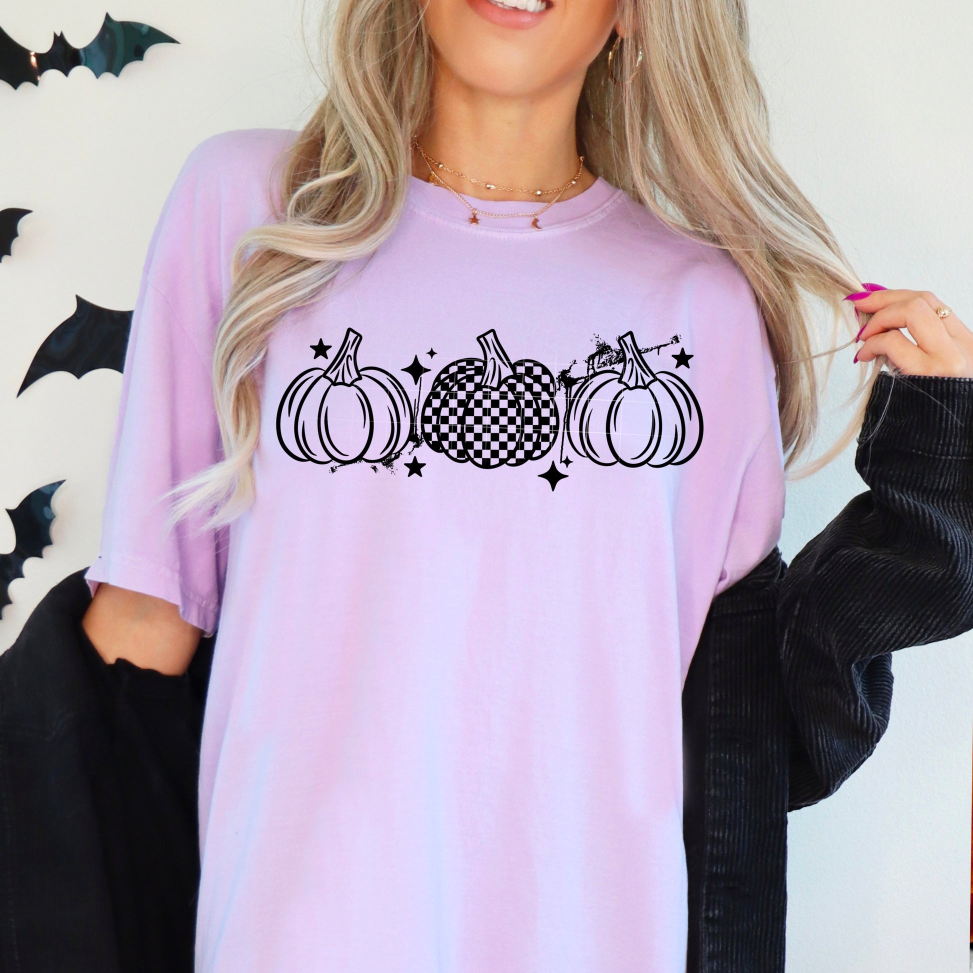 Celebrate fall with this playful tee featuring a simple line of three pumpkins in a charming checkered print. Its minimalist design and black ink make it easy to pair with your favorite casual outfits, adding a touch of autumn fun wherever you go. Perfect for pumpkin lovers wanting a subtle, stylish seasonal statement.