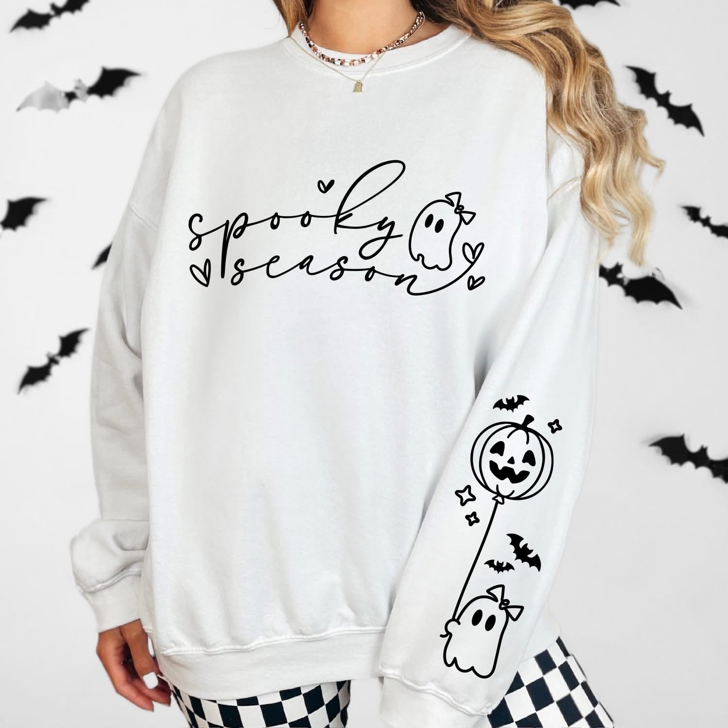 Celebrate the spooky season with this playful sweatshirt featuring an adorable little ghost drawn in bold black ink. Its whimsical design extends to the sleeves, adding a fun, unexpected twist that makes it perfect for cozying up or Halloween fun. Embrace the charm and spirit of the season in comfort and style!