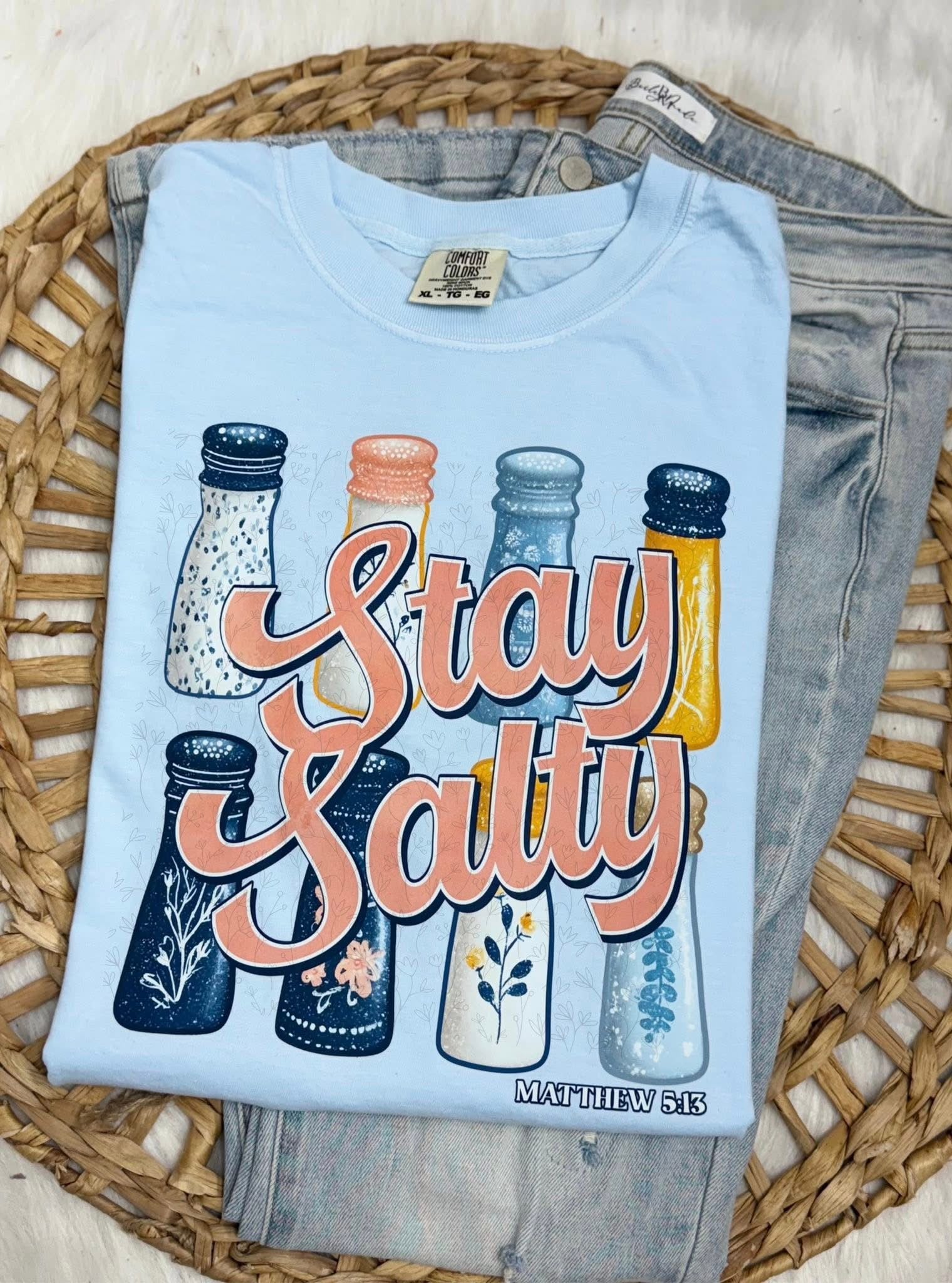 Stay Salty and stay faithful with this playful designer original that blends Christian inspiration with a dash of humor. Featuring a vibrant design showcasing eight salt bottles in beautiful blues, yellows, and corals, this tee celebrates the biblical call to be "the salt of the earth." Perfect for those who wear their faith with joy and personality, it combines quality craftsmanship with a message that resonates. Whether you're gifting it to a fellow believer or treating yourself, this piece is a fun, colorful way to express your spiritual values and keep your sense of humor intact.