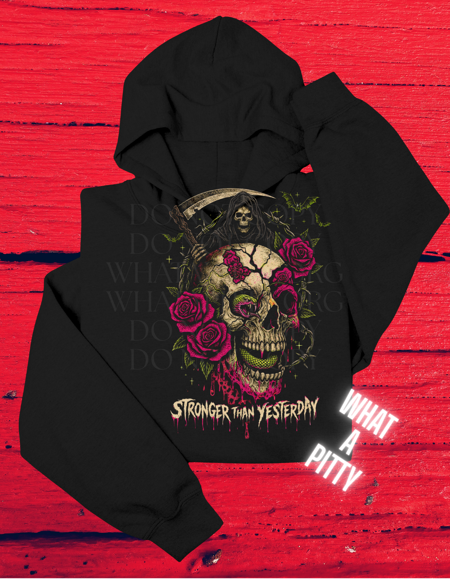 Celebrate your glow-up with this designer original that pairs a bold skull with blooming pink roses—a cheeky reminder that strength and beauty go hand in hand. This exclusive design captures the spirit of transformation and resilience with playful flair, blending edgy symbolism with romantic florals for a look that's unapologetically you. Perfect for anyone who's conquered their demons and emerged more fabulous than ever.