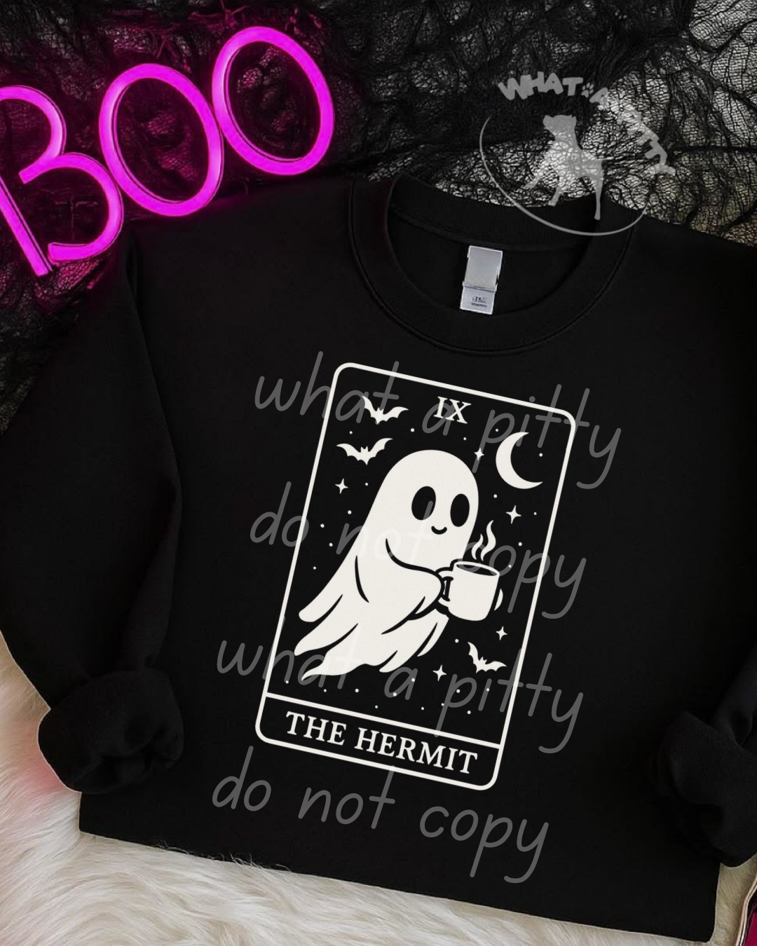 Discover a playful twist on the classic tarot with “The Hermit,” featuring a whimsical ghost guiding the way. This fun design brings a mysterious yet lighthearted vibe, perfect for those who love a little magic with a smile! Make a bold statement with this designer original, exclusively available on black.