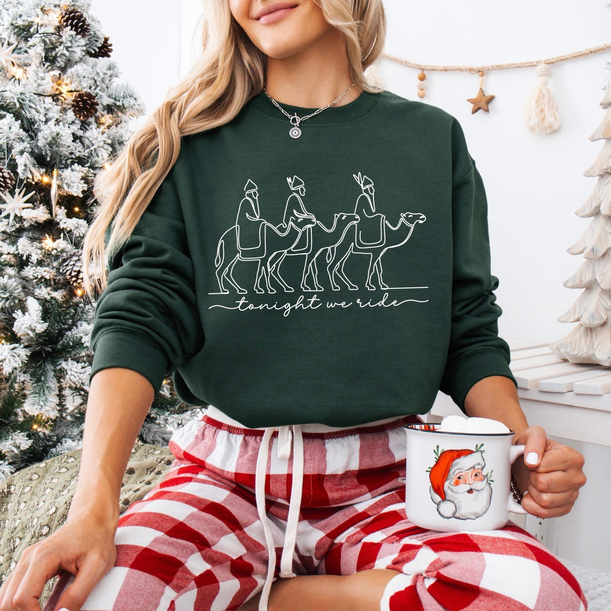 Celebrate a timeless journey with the Tonight We Ride tee, featuring three wise men on camels heading toward Jesus. This playful design captures faith and adventure in one bold statement, perfect for those who love meaningful style with a touch of fun. Wear your story and ride into the night with inspiration and spirit.