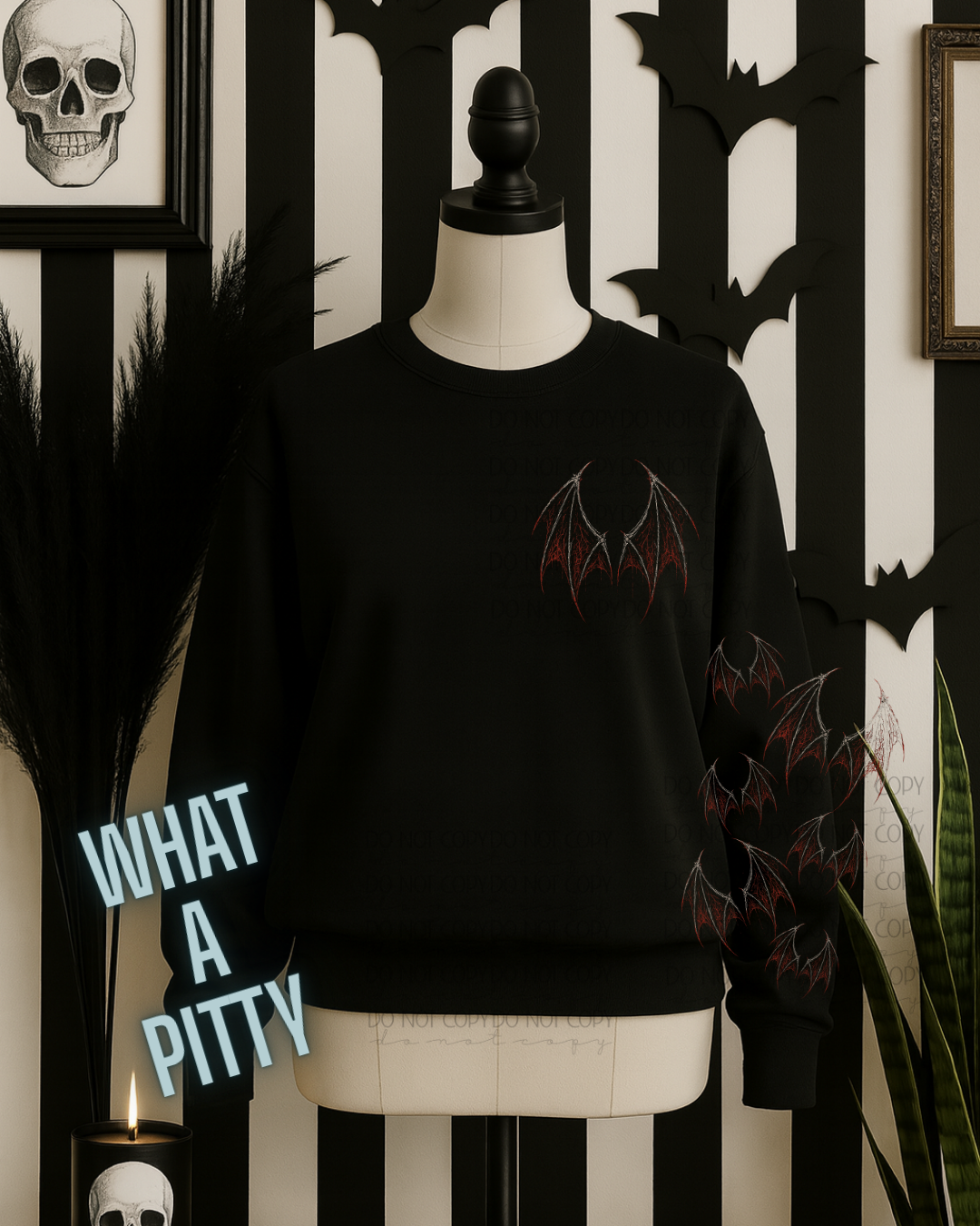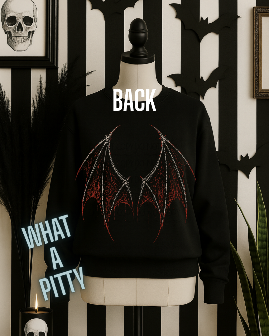 Spread your wings with this stunning designer original from What A Pitty! This gothic-inspired piece features a striking black, red, and white color palette with a small print detail on the left pocket and dramatic wings cascading down the sleeve. But wait—flip around to reveal extra-large wings commanding the back. It's bold, it's beautiful, and it's unmistakably What A Pitty. Perfect for those who dare to stand out.